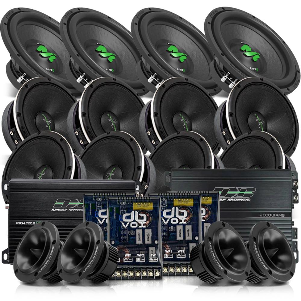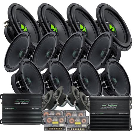 Paketet innehåller 4st Machete basar från Lite serien och hela 8st midbasar från DeafBonce (ö)kända Machete serie. 4st DeafBonce T-34 diskanter står för de högre tonerna som separeras med 4st delningsfilter. Hela systemet drivs med 2st DeafBonce slutsteg.